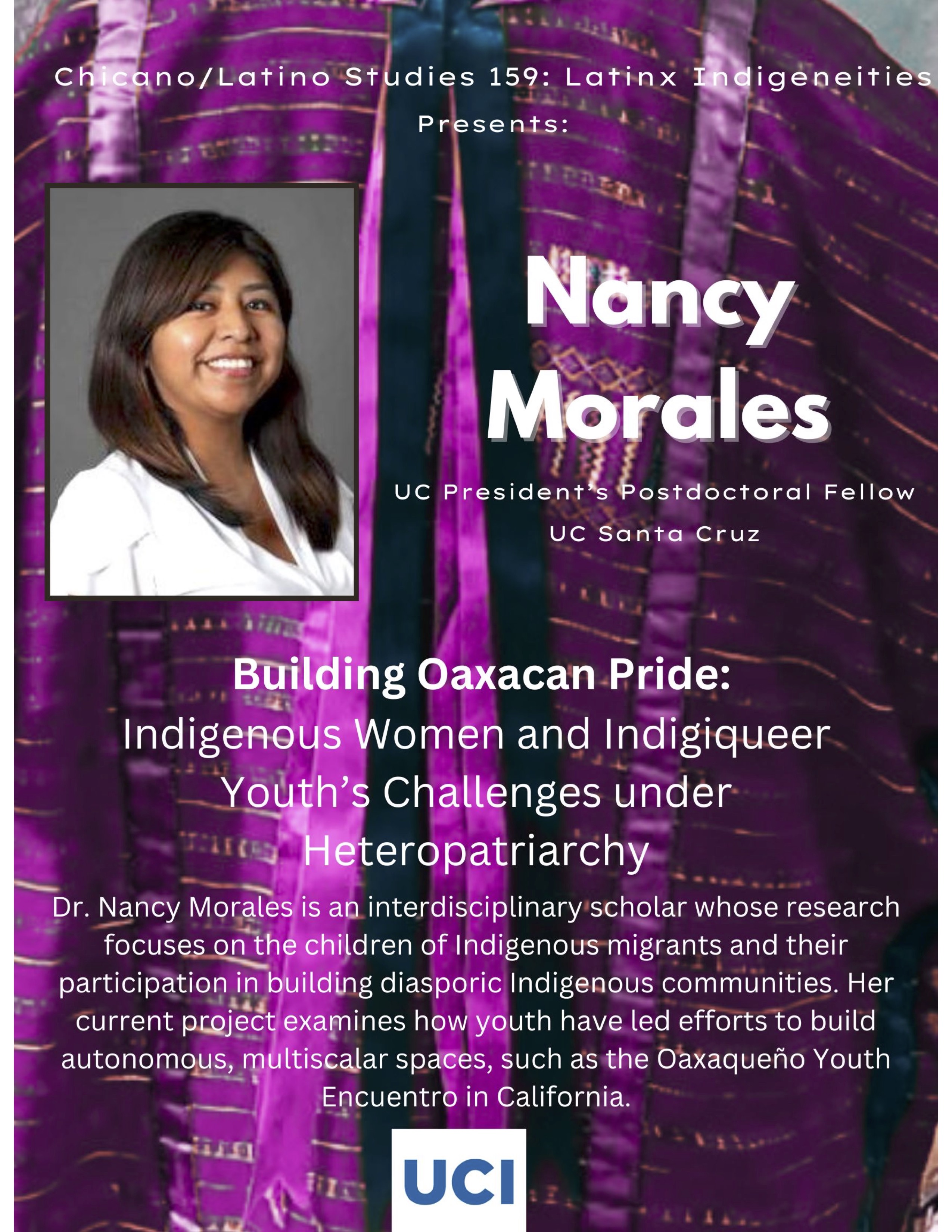 Dr. Morales is an award-winning instructor, who has taught a variety of courses at UC Santa Barbara and at Ithaca College. Her anticolonial pedagogies are collaborative and transform spaces of learning within and outside higher education. She has expertise in Indigenous Latinx women and Indigenous queer peoples’ struggles for sovereignty in California’s Central Coast and Central Valley. She is interested in teaching courses that focus on Critical Latinx Indigeneities, settler colonialism, sovereignty, Indigenous research methodologies, Indigenous Queer studies, Latinx studies, Native Indigenous families, California Indigenous peoples from the United States and Mexico, and Native Indigenous feminisms.